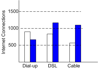 Question 2: The number of internet connections of an US town is shown in the bar graph below. White bars represent connections in 2009 and blue bars represent connections in 2010. Which types of connections increased by more than 500 from 2009 to 2010?