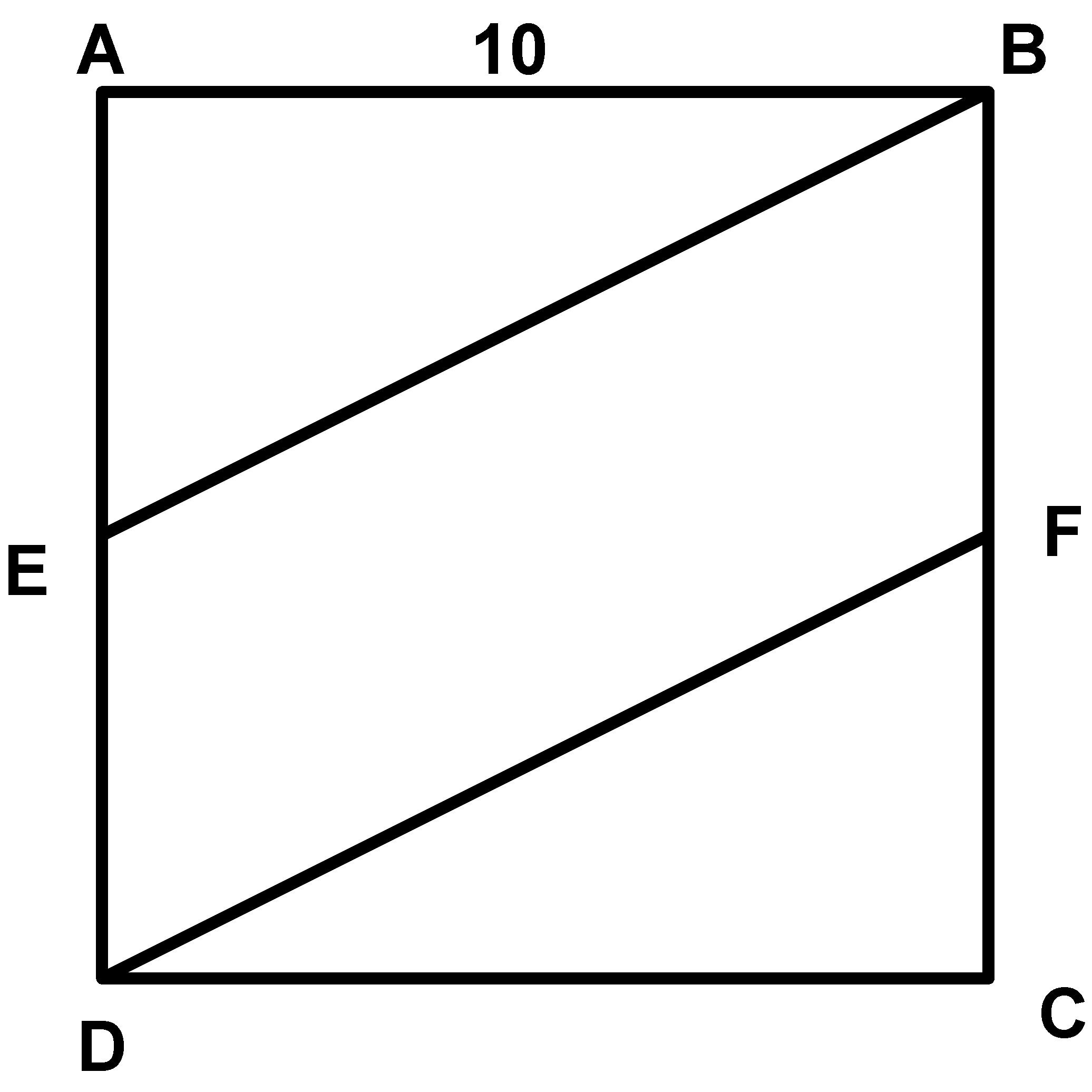 Question 1: What is the area of rectangle ABCD if the length of the diagonal AC is 10? Question 2: What is the area of triangle ABD in the figure below, if ABCD is a trapezoid? 6 8 9 10 Question 3: The ratio of the radii of two circles C1 and C2 is 2.5. The ratio between the areas of circles C1 and C2 is: 2.5 4.75 6.25 1.25 Question 4: The square S and the rectangle R in the figure below have equal areas. What are the length and the width of the rectangle R, if the sides of square S measure 6cm each, and if the perimeter of rectangle R measures 26cm? 12cm and 3cm 7cm and 6cm 6cm and 6cm 9cm and 4cm Question 5: Which of the following represents the area of triangle ABC in the figure below? Question 6: The side AB of the ABCD square is 10, AE = ED and BF = FC. What is the area of parallelogram BFDE? 50 55 60 65 Question 7: In the figure below, the area of square ABCD is equal to the sum of the areas of triangles ABE and DCE. If AB = 6, then CE = 2 3 4 5 Press the Submit button to see the results.